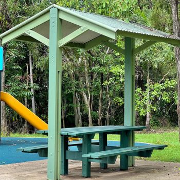 - a new picnic table including seating and a shade shelter